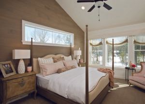 The large Master Bedroom Suite’s wallplank accent wall with oversized transom window is eye catching and ties together the natural theme of the room. Earth tones paired with a rustic 4-post bed and decorative nightstands add casual elegance as well as a softness and feminine touch.