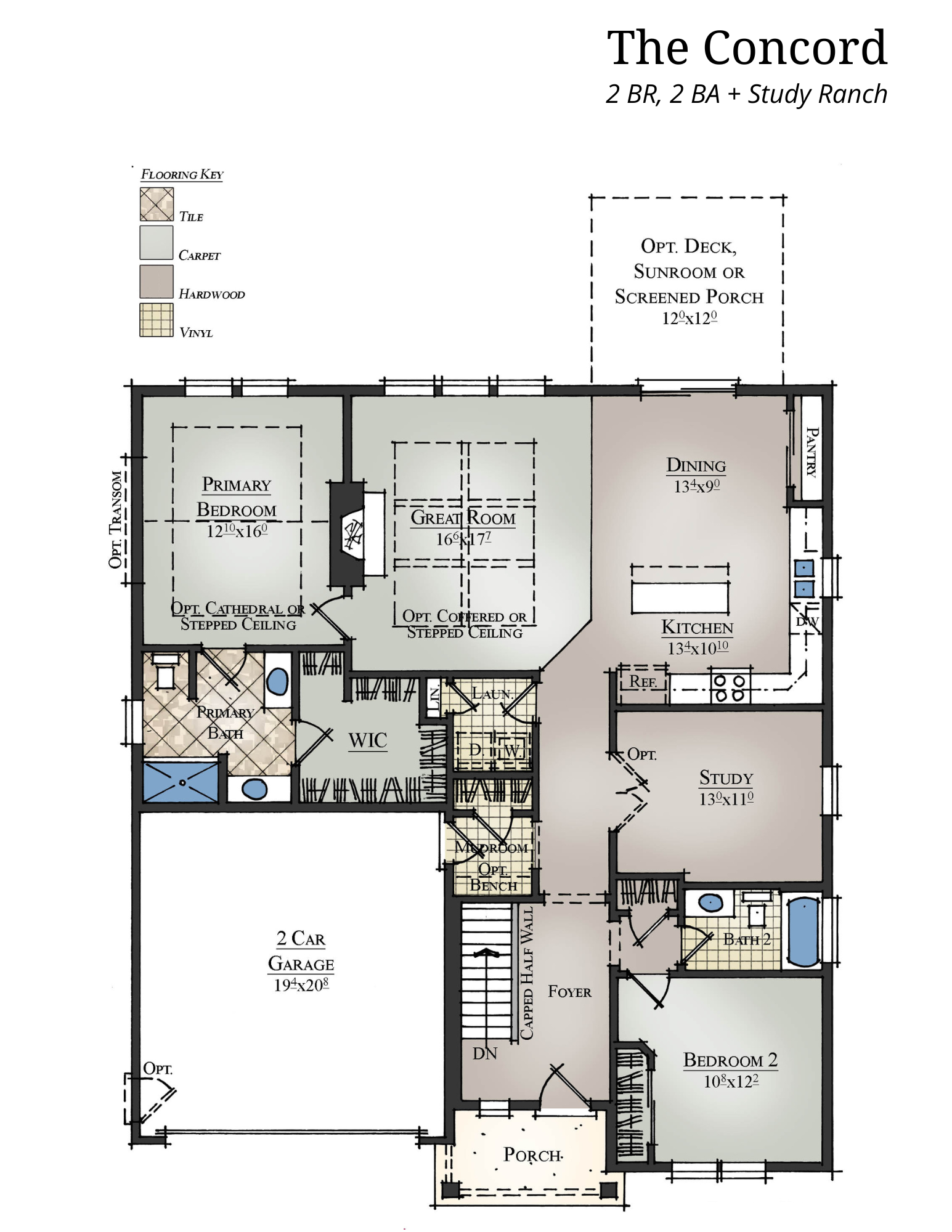 This cozy ranch is surprisingly spacious is perfect for both new families or those looking to downsize. The Concord is available in three charming elevations and makes a great first impression with a large foyer that opens to a staircase leading to the lower level (a look typical of larger 2-story homes). A private alcove off the entry foyer leads to a front bedroom and full bath. A formal study with the option to add French doors adds a touch of elegance to the home or, if needed, can be built as a third bedroom.