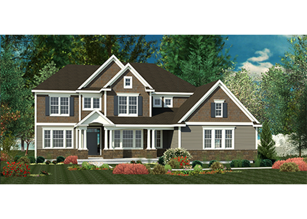 - Traditional front elevation with a hipped roof and a tasteful mix of shake siding on the second floor and a combination of horizontal siding and stone on the first floor.