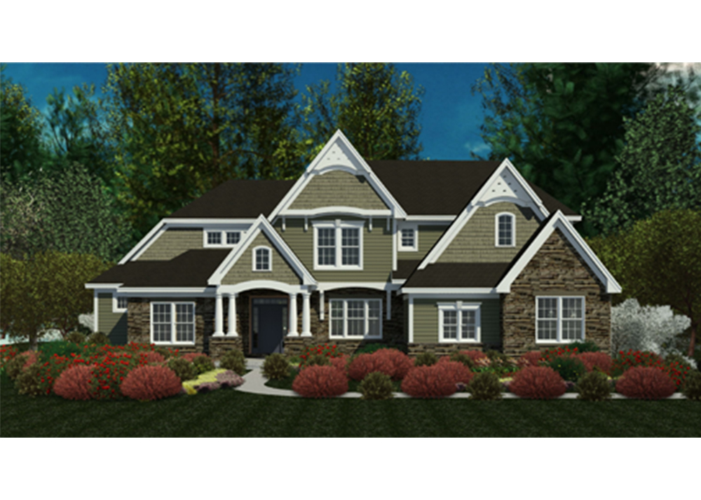 - Traditional front elevation featuring steep pitched gables with in elegant mix of stone and both horizontal and shake siding.