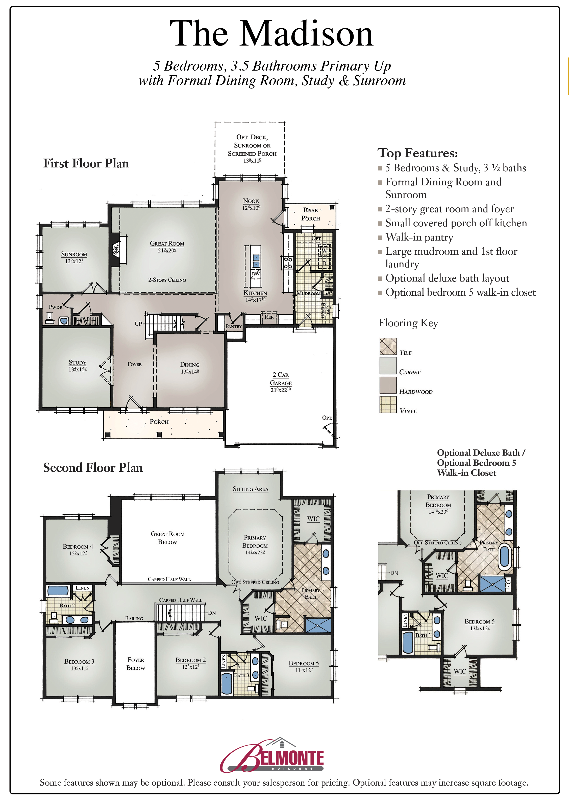 Upstairs, the primary bedroom suite features a sitting area and optional stepped ceiling. The primary bath features an extended double-sink vanity, tile floors and an over-sized ceramic tile shower with the option for a separate soaking tub. Two separate walk-in closets offer plenty of room for storage. Four additional bedrooms and two full baths complete the second floor.