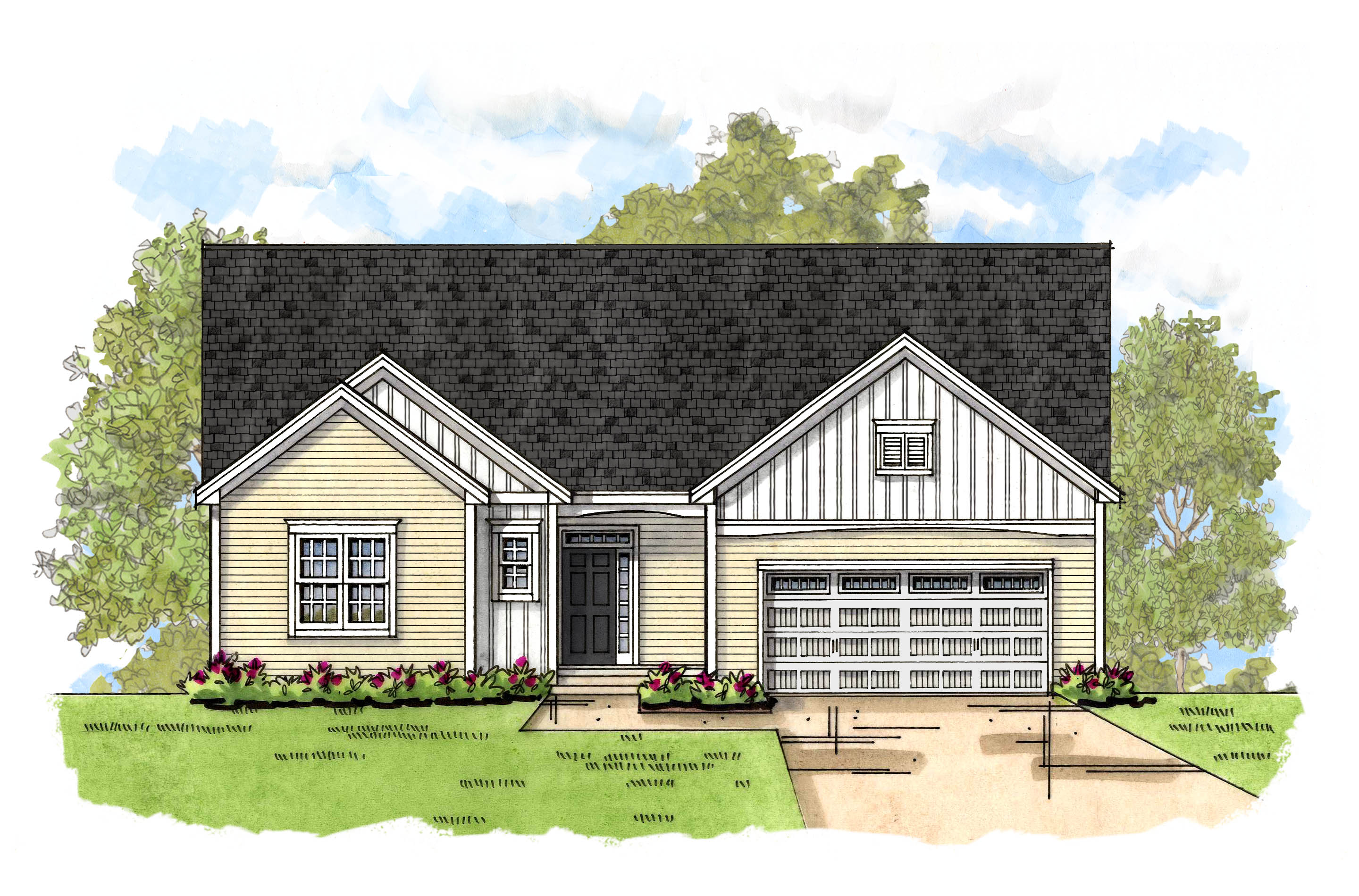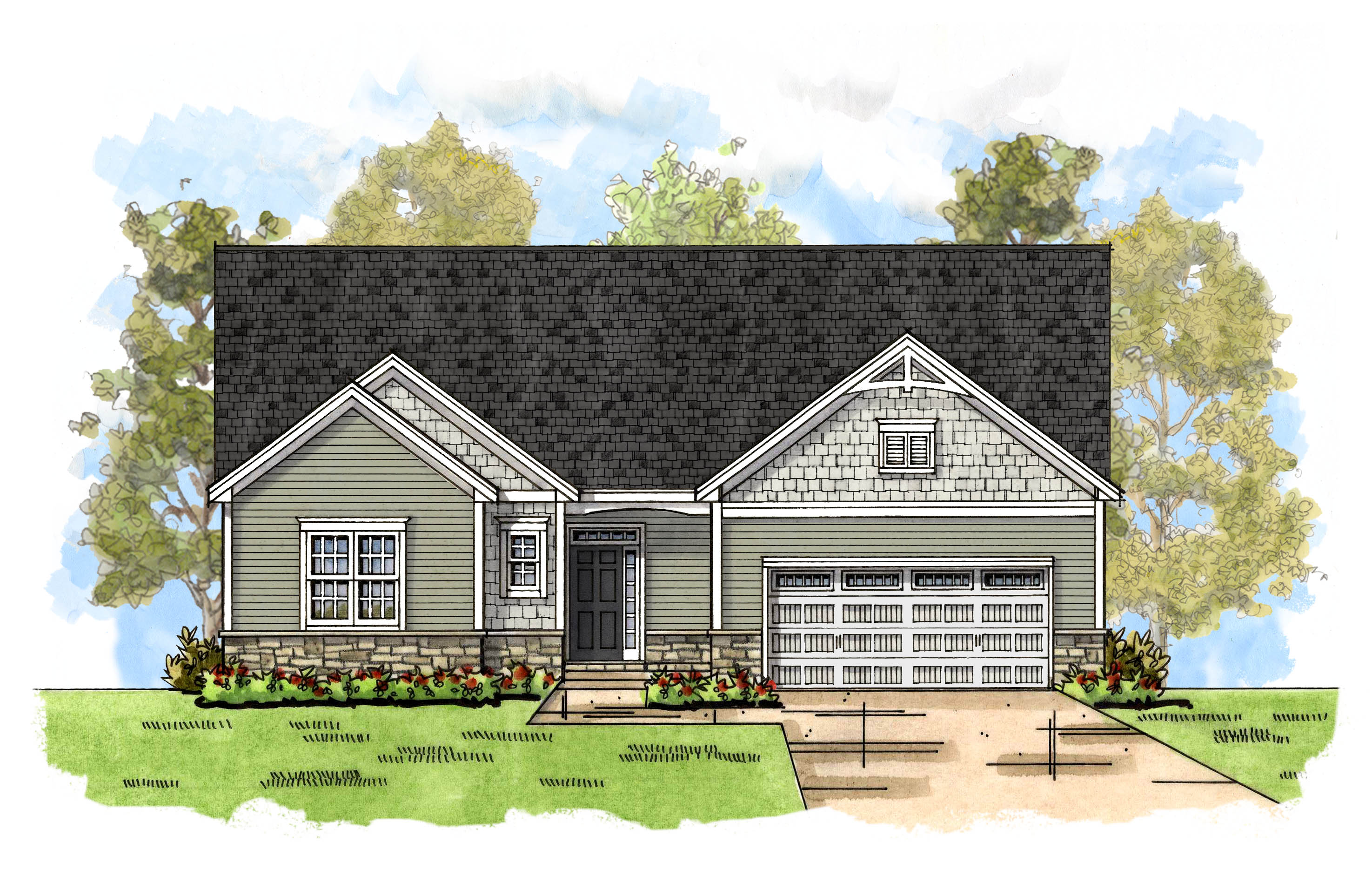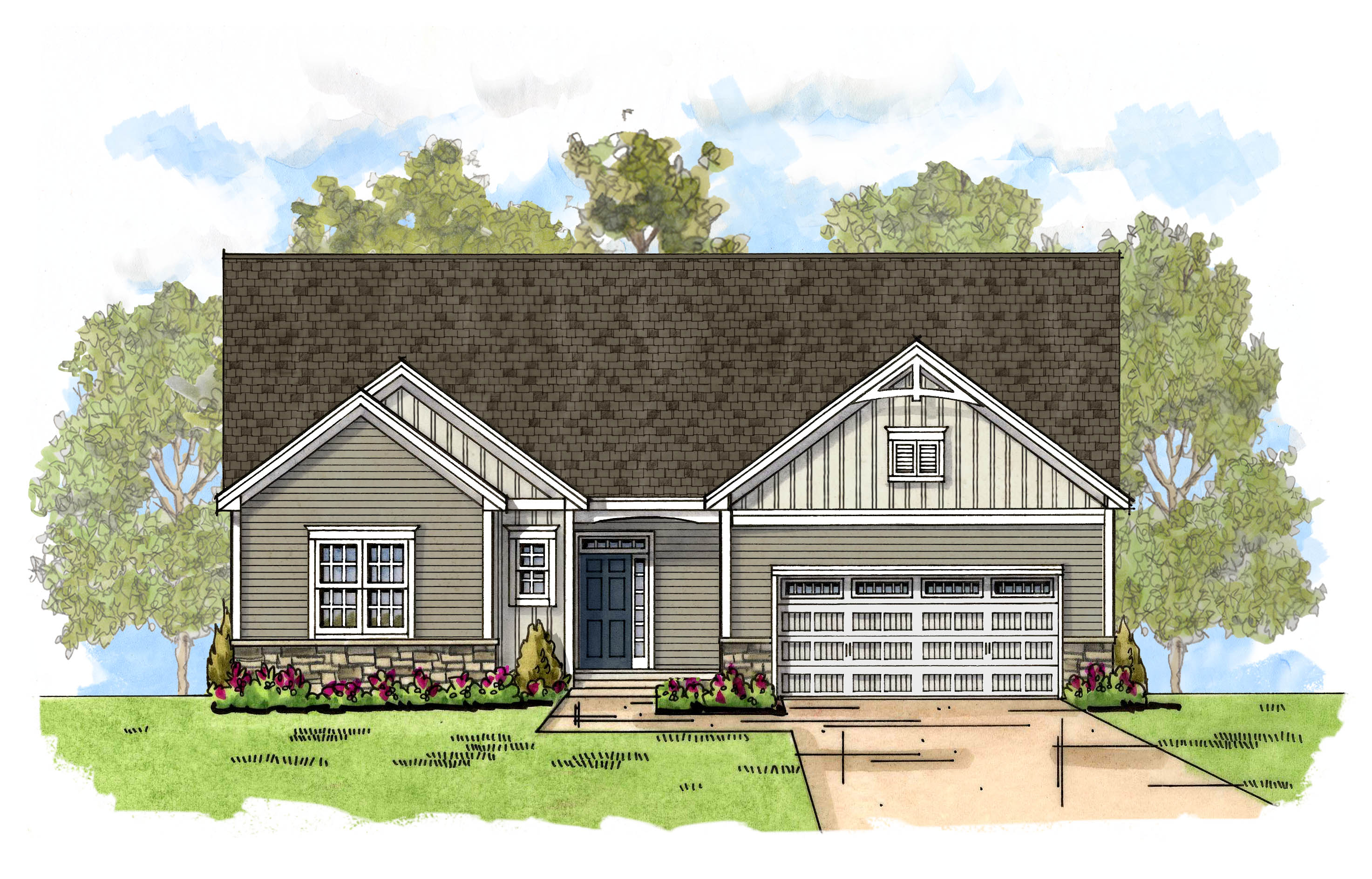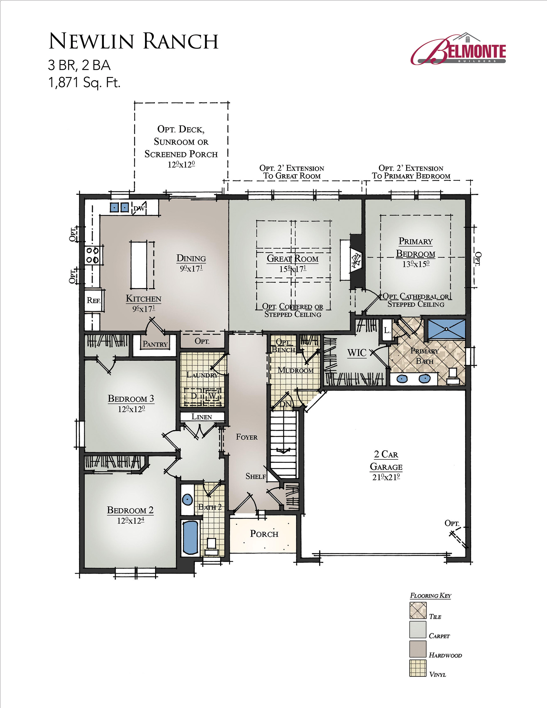 The primary bedroom suite is roomy and can be personalized with an optional stepped or cathedral ceiling and/or a large transom window. The primary bath features an extended double-sink vanity with quartz countertops, tile floor, linen closet, and opens to the large walk-in closest. The mudroom with an optional bench is conveniently located off the 2-car garage.