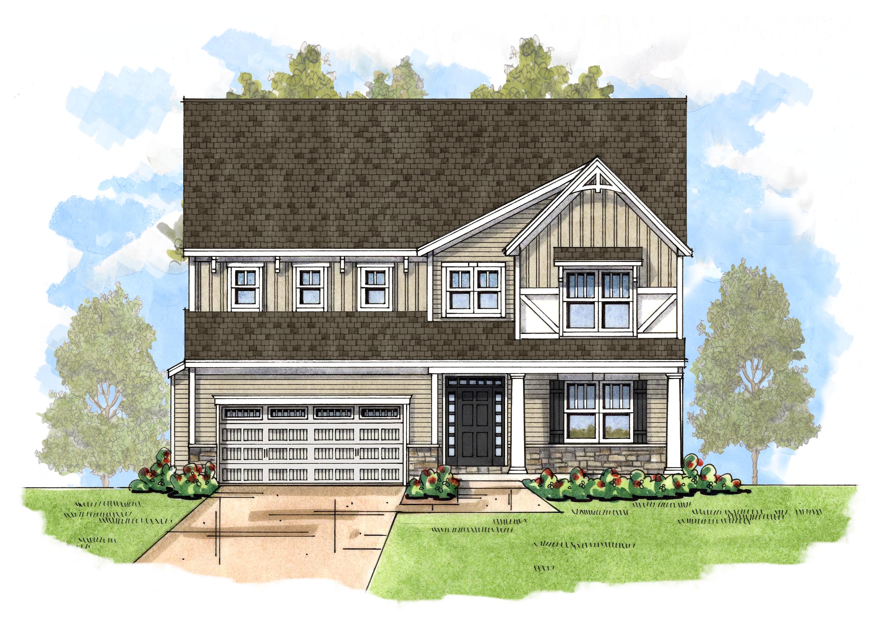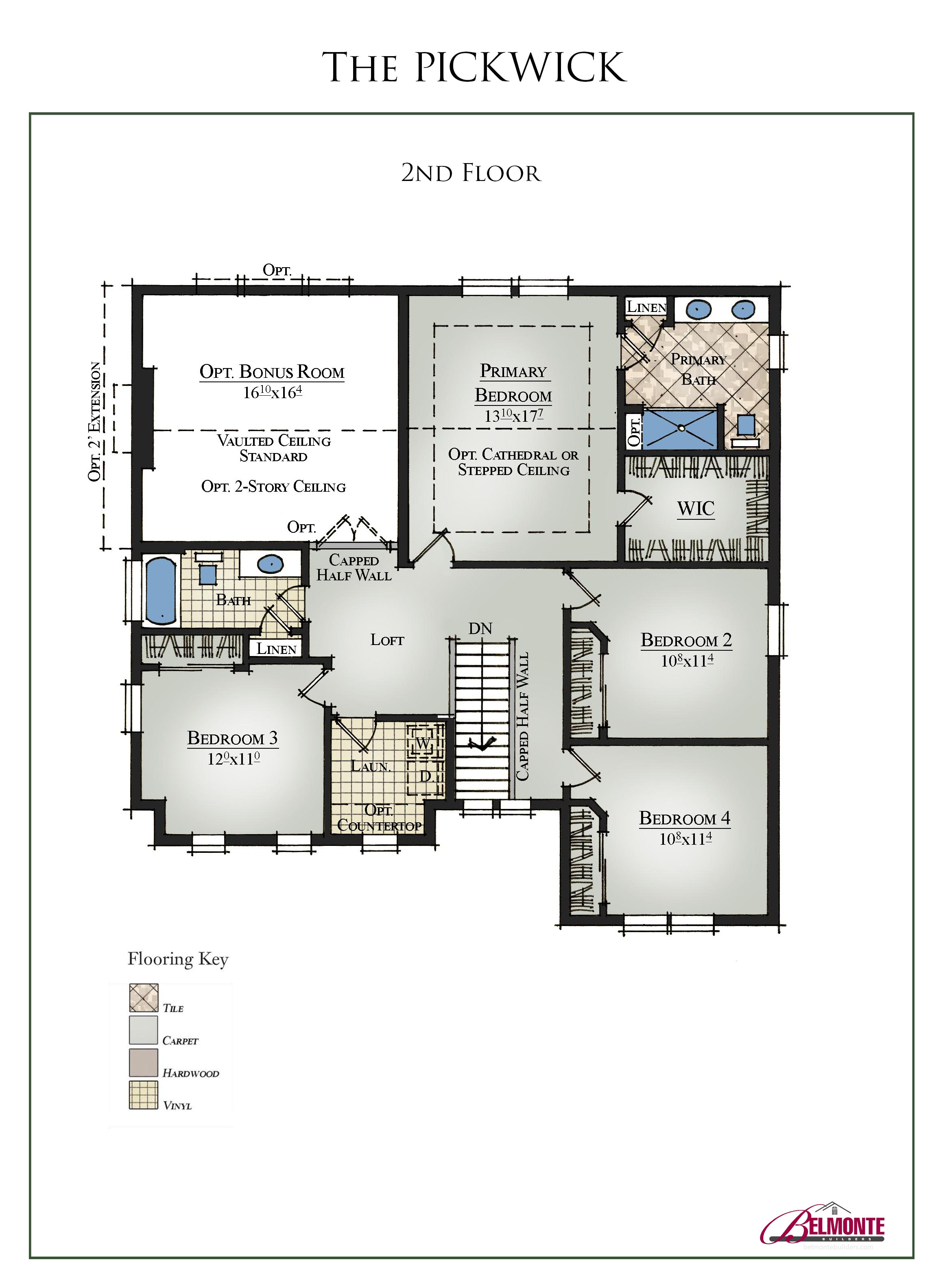 Upstairs a capped half wall offers views into the great room below or can be used as entry to an optional bonus room if chosen. The primary suite is spacious and enjoys a large walk-in closet and the option to add a stepped or cathedral ceiling. The primary bath features a double-sink vanity with quartz countertops, tile floor and linen closet. Three additional bedrooms sharing a full bath and a laundry room complete the 2nd floor