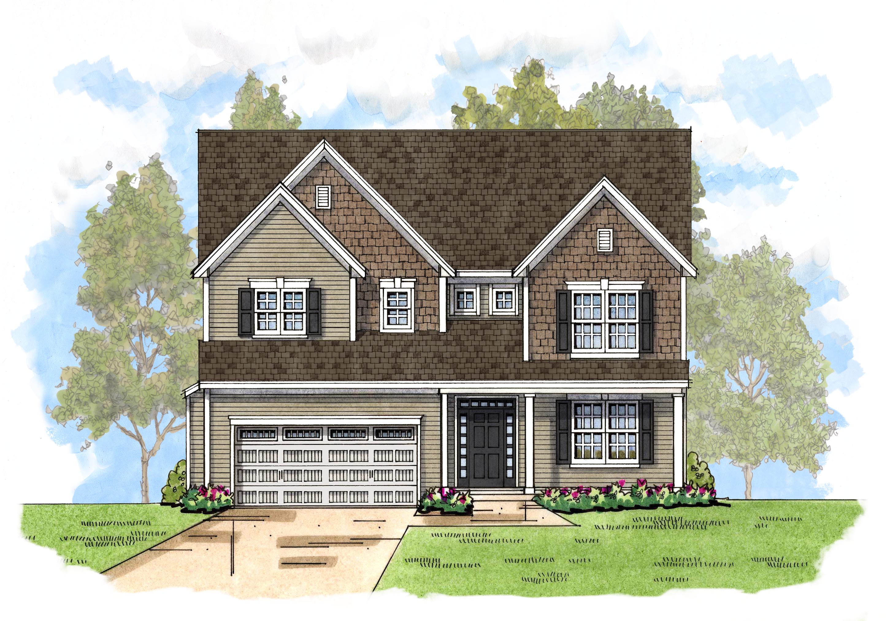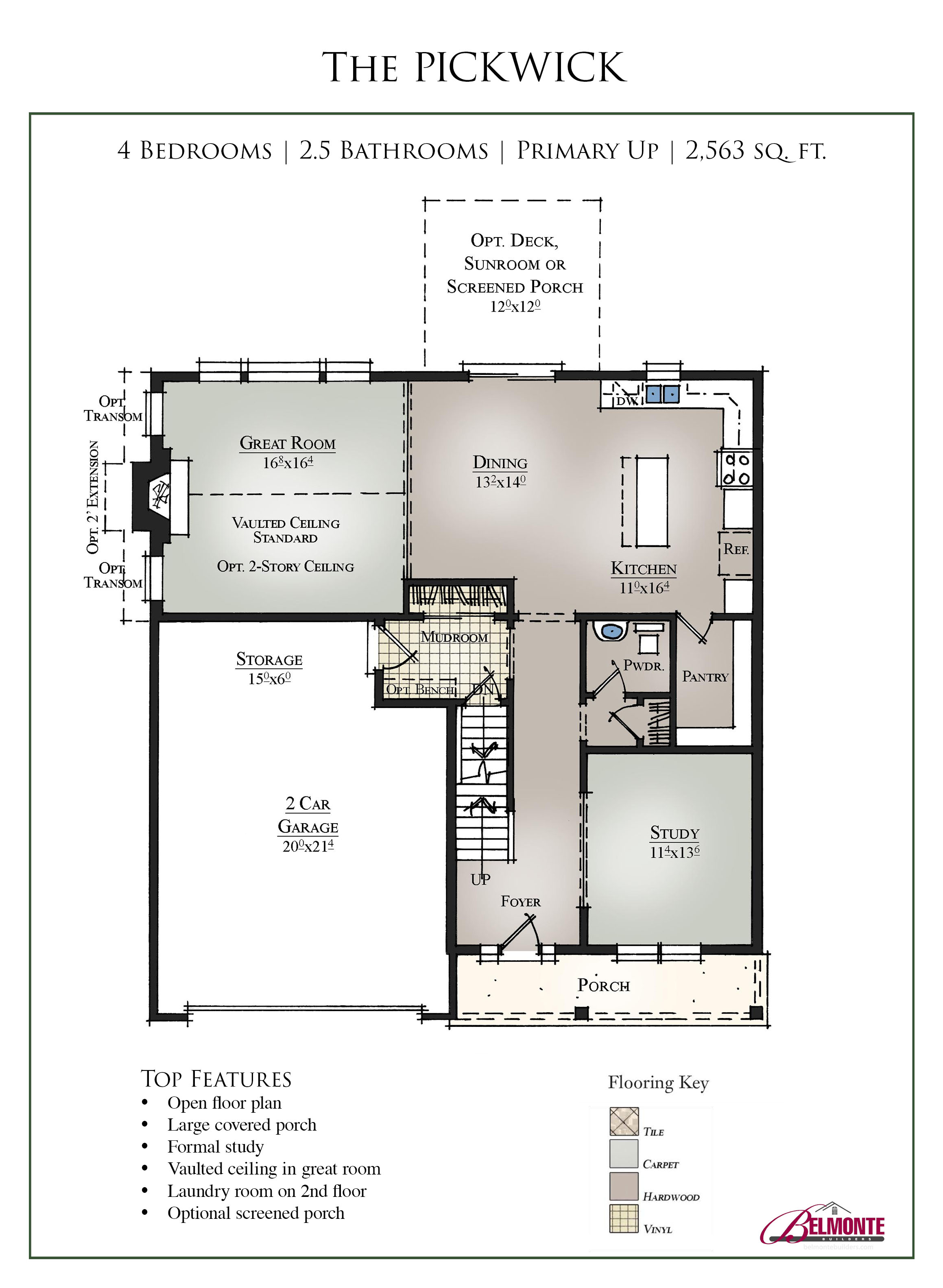 This traditional primary up floor plan enjoys a covered porch and large entry foyer. A formal study with optional French doors makes a great first impression. The Pickwick's open floor plan lends itself to entertaining and family get togethers with the kitchen open to both the dining area and great room. The spacious kitchen has room for everything featuring a large island and a walk-in pantry. The great room features a vaulted ceiling or optional two-story ceiling and a gas burning fireplace with granite surround and wood mantel. It shares an abundance of natural light from three large windows with the kitchen and dining area. If you want a little more space, this floor plan also offers the option to extend the great room by 2 feet. A deck, screened porch or sunroom can also be added off the dining area. A mudroom is conveniently located off a two-car garage.