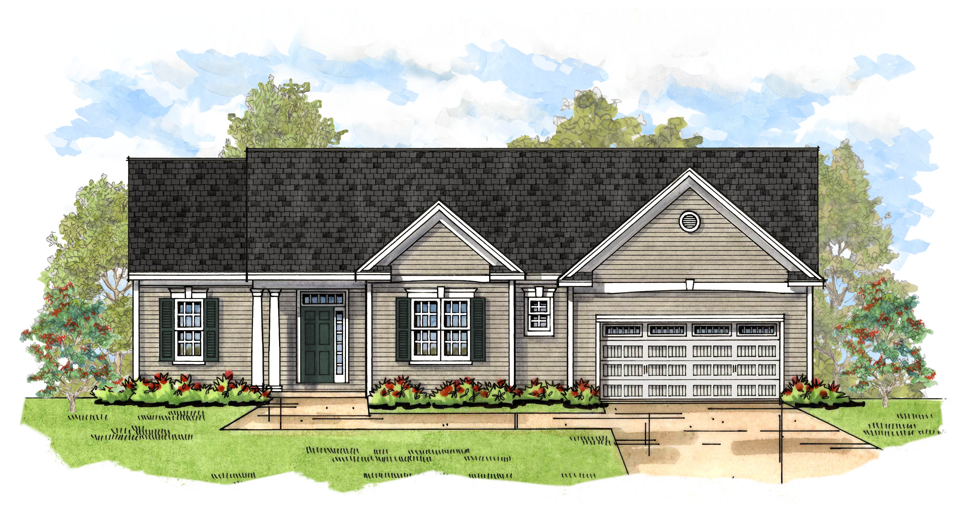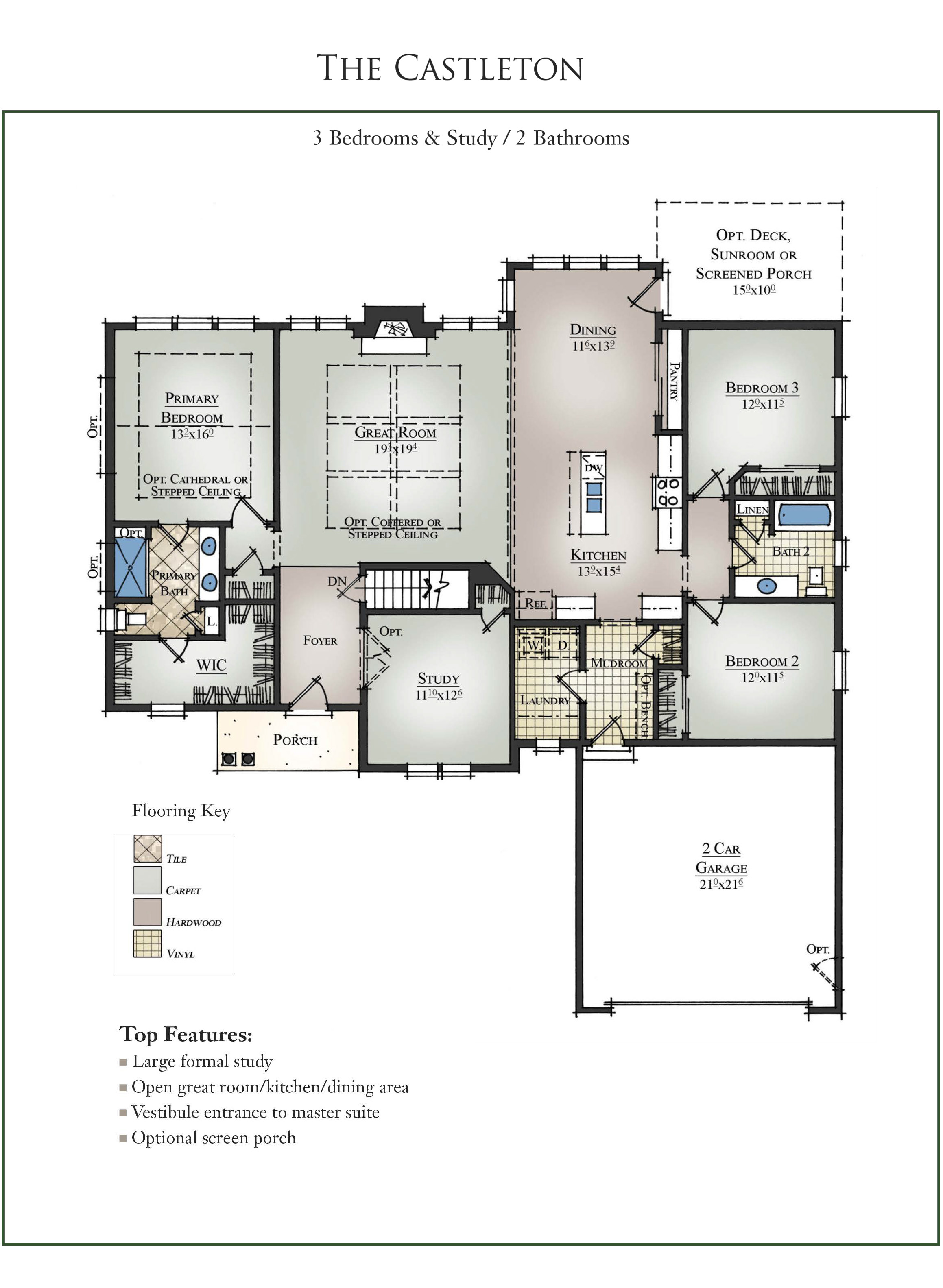 The Castleton ranch floor plan is available in three attractive elevations all including a covered porch. This award-winning open concept floor plan is perfect for comfortable living and entertaining. A large entry foyer opens to an elegant study with optional French doors. The spacious great room has the option of a coffered or stepped ceiling and opens to the kitchen and dining area. Featuring a gas burning fireplace with granite surround, it shares an abundance of natural light from a wall of large windows with the rest of the main living area. The kitchen has room for everything and a large working island provides extra space for food prep. An optional screened porch/sun room offers additional living space.