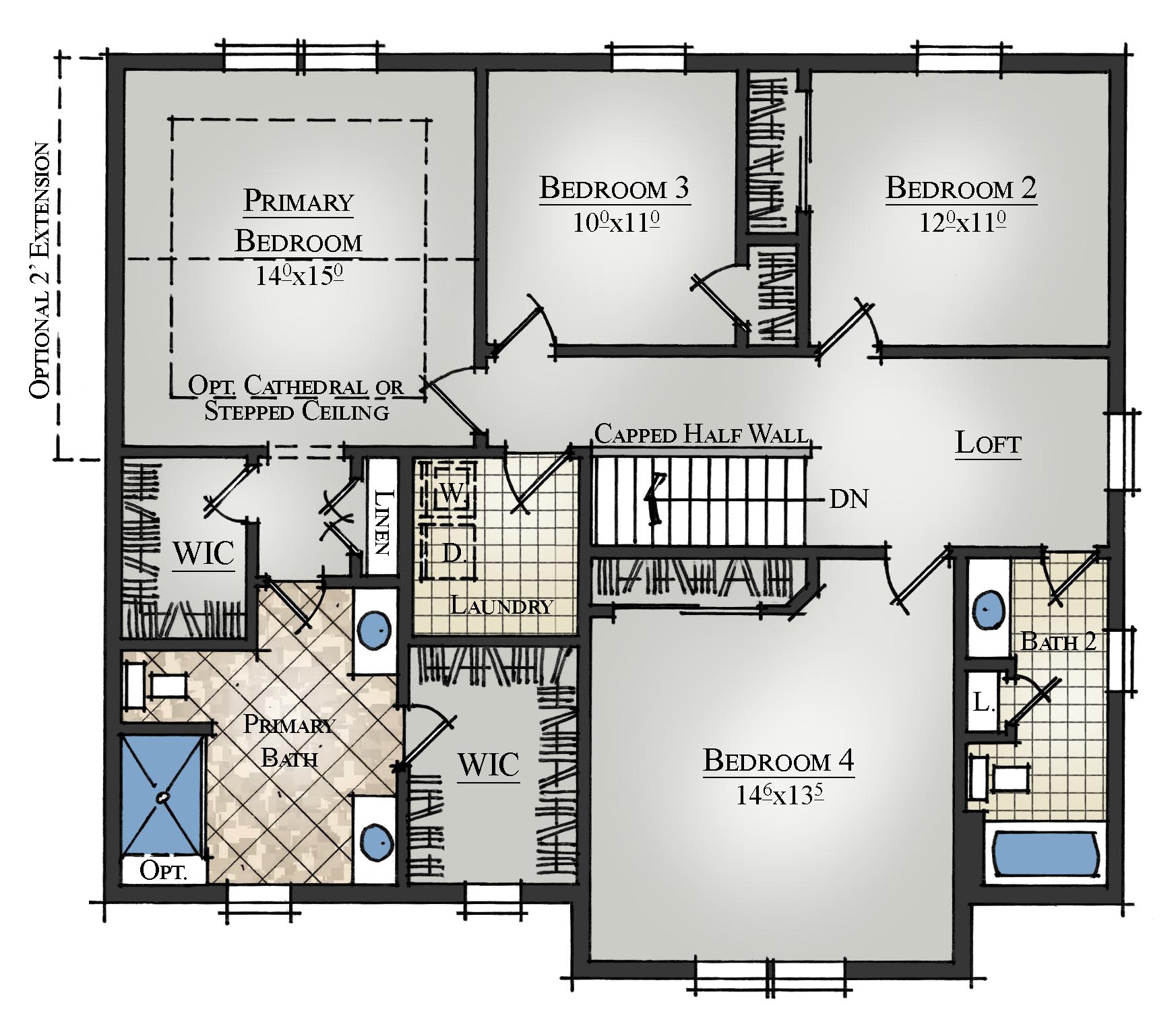 The 2nd floor primary bedroom suite offers the option of either a cathedral or a stepped ceiling. The primary bath features an extended double vanity with quartz countertops, a linen closet, and access to two walk-in closets. The laundry room, a loft and 3 additional bedrooms are also conveniently located upstairs. A mudroom with a walk-in closet is located between the kitchen and a two-car garage.