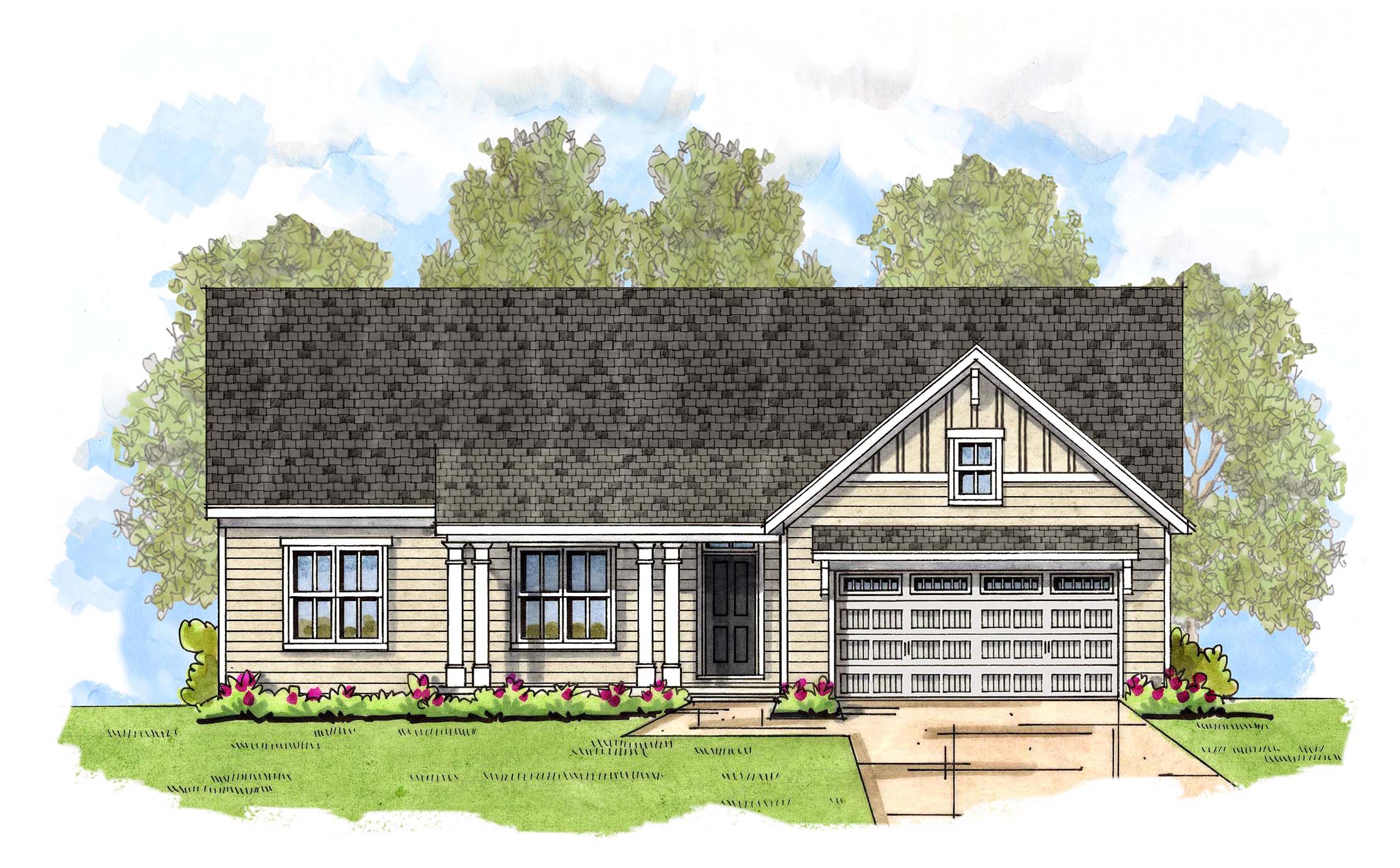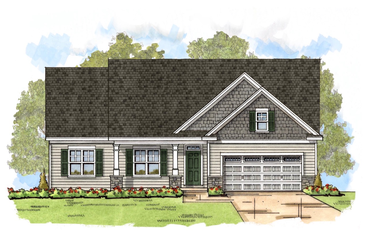 This 3 BR + Study, 2 BA ranch floor plan was designed for comfortable living. A large covered porch makes a great first impression. The open floor plan is perfect for entertaining or family gatherings with the great room flowing seamlessly into the kitchen and dining area. The great room enjoys an abundance of natural light from three large windows and features a gas-burning fireplace plus the option to add a coffered or stepped ceiling.