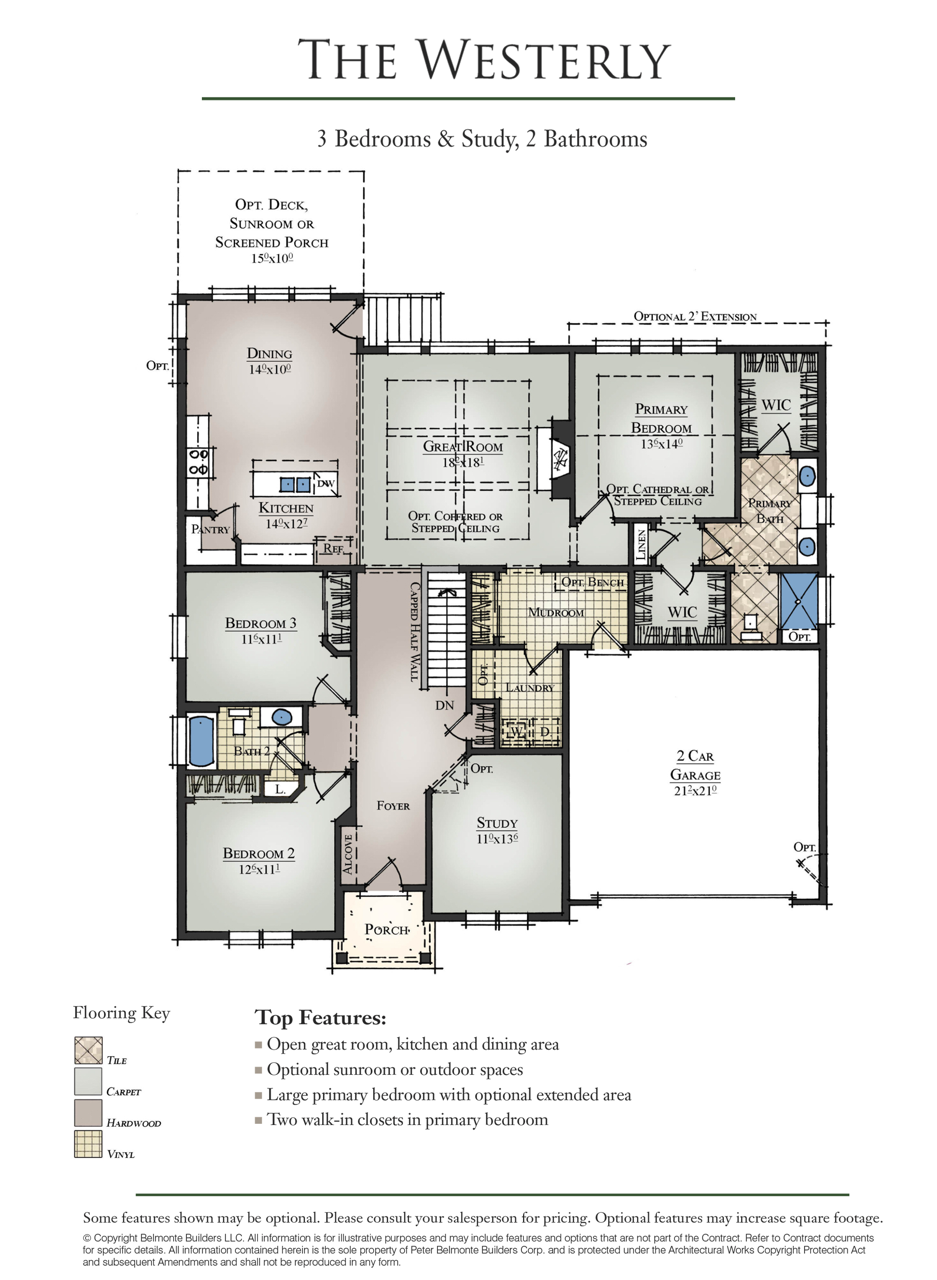 Our goal when developing the Westerly was to create an inviting and open ranch plan to fit customers’ needs whether downsizing or growing their family. This charming cottage/bungalow has great street appeal and is available in three elevations. Upon entry, a large foyer opens to a formal study with optional French doors.