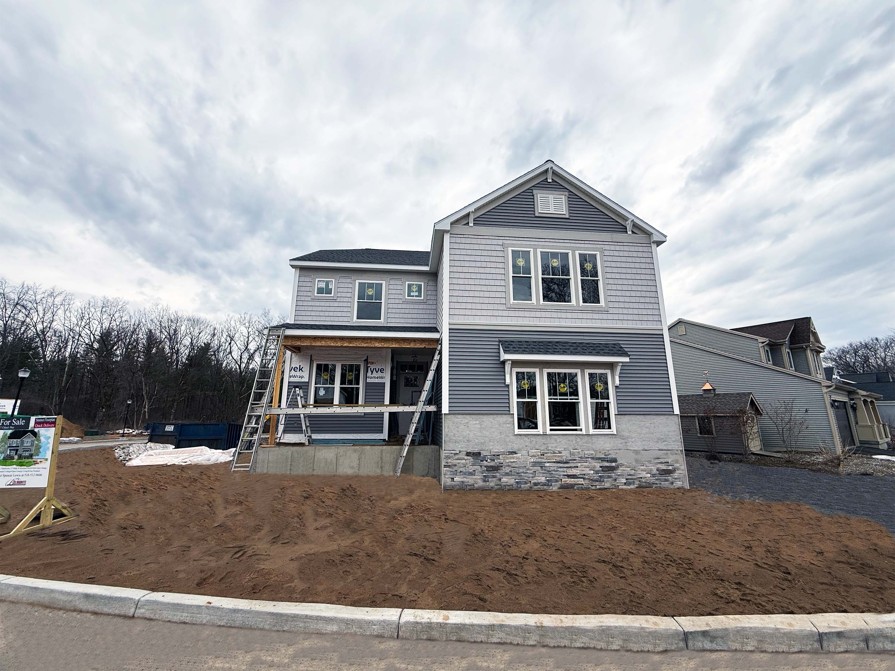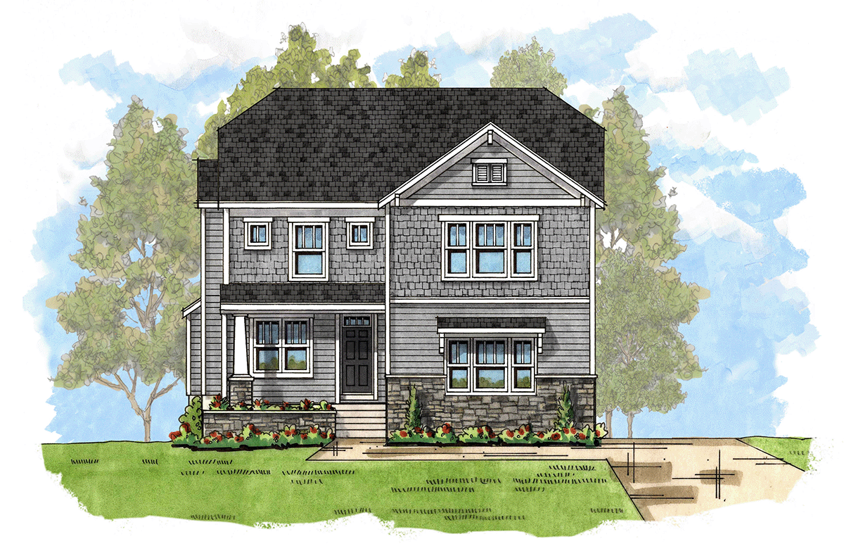 - Charming elevation with a large, covered porch and a side load garage